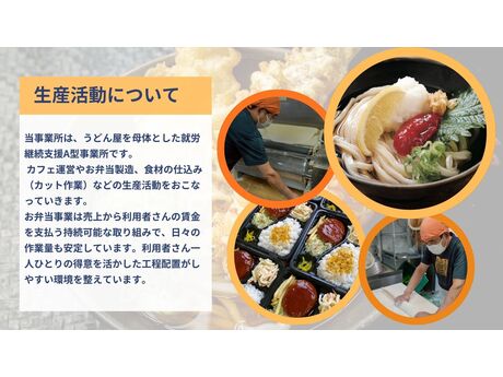 お弁当づくりやカフェ、うどん店での作業など、飲食に関わる生産活動を通して「働く力」を育てる事業所です。